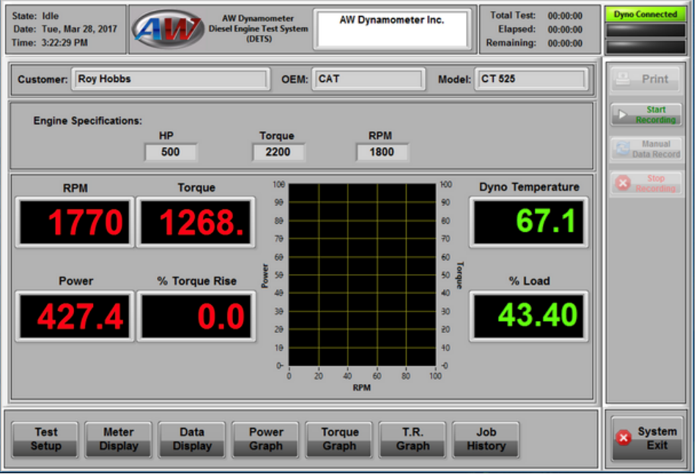 El software de control de carga DETS-XT está basado en LabView y es capaz de operar en un entorno Windows. El software se carga en cualquier PC o laptop y se conecta al AW2100sXT a través de Ethernet. Realizar una prueba de potencia es sencillo: el operador selecciona la duración de la prueba y el número de lecturas a tomar, y el software registra automáticamente los datos. Al finalizar la prueba, se pueden generar y imprimir un informe de prueba y gráficos de torque y potencia. Las pruebas se pueden almacenaren una biblioteca de historial y luego recuperarse para reimpresión o comparación. Una nueva función importante permite al operador controlar la carga del dinamómetro desde el software.