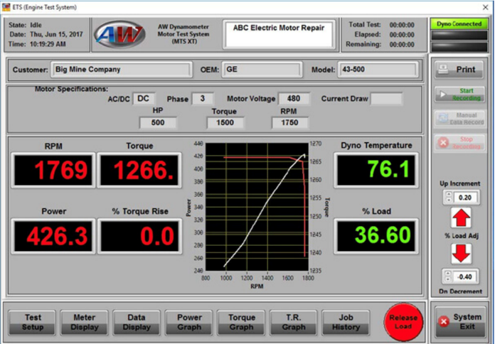 El software de control de carga MTS-XT está basado en LabView y es capaz de operar en un entorno Windows. El software se carga en cualquier PC o laptop y se conecta al AW 2100sXT a través de Ethernet. Realizar una prueba de potencia es sencillo. El operador selecciona la duración de la prueba y el número de lecturas a tomar, y el software registra automáticamente los datos. Al finalizar la prueba, se pueden generar y imprimir un informe de prueba y gráficos de torque y potencia. Las pruebas se pueden almacenar en una biblioteca de historial y luego recuperarse para reimpresión o comparación. Una nueva función importante permite al operador controlar la carga del dinamómetro desde el software.